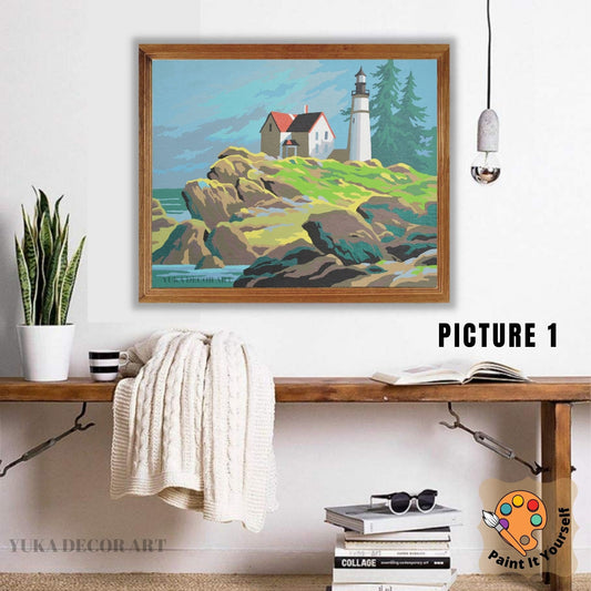 Vintage Style Paint by Numbers Kit for Adults , Lighthouse Island House , Canvas Painting Kit - Rustic Decor DIY Art Kit