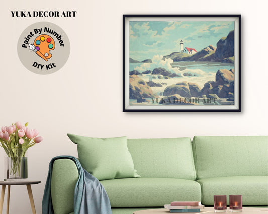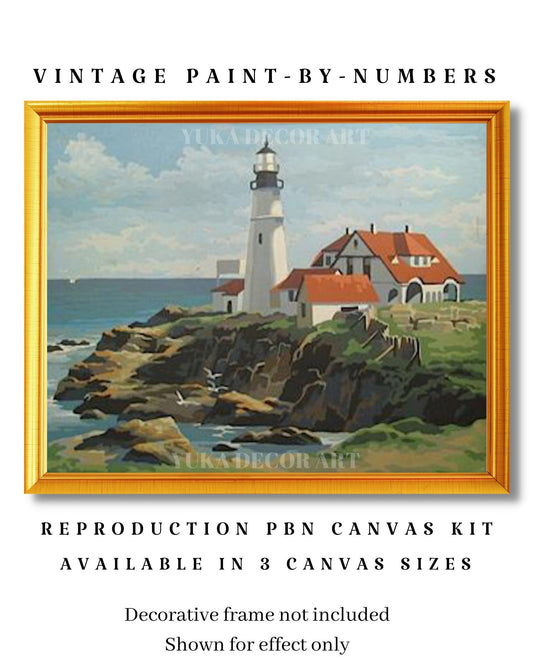 Vintage Style Paint by Numbers Kit for Adults Beginner, Lighthouse On Rocky Seashore , Canvas Painting Kit - Rustic Decor DIY Art Kit