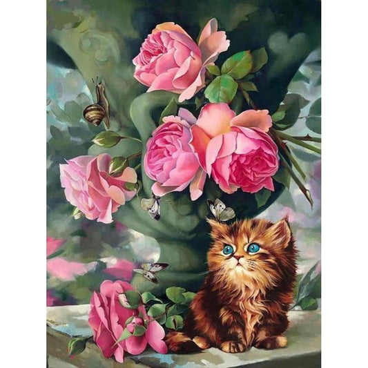 PINK ROSES WITH GOLDEN KITTEN Diamond Painting Kit