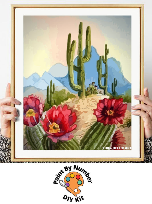 Desert Landscape PAINT by NUMBER Kit, Cactus Flowers Sunset Mountain View , Easy DIY Beginners Acrylic Painting Kit , Wall Art Gift