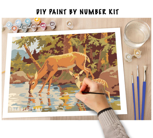Deers in Forest PAINT by NUMBER Kit Adult , Mountain Stream Vintage Style DIY Art , Easy Acrylic Paint Kit,Christmas Decor Gift
