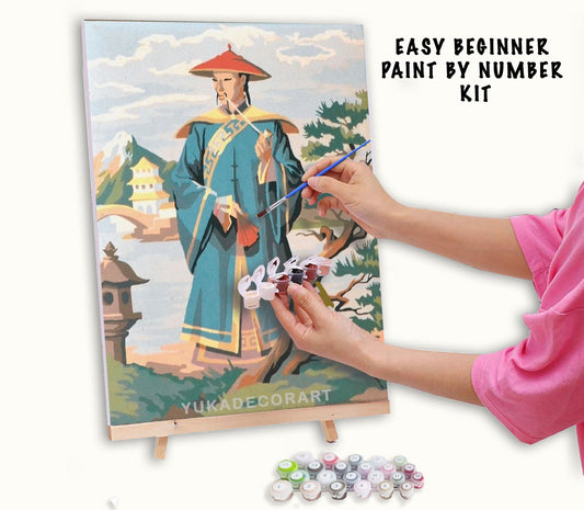 Oriental Man Vintage PAINT by NUMBER Kit Adult , Asian Wall Decor ,Japan Garden Landscape ,Asian Theme Easy DIY Beginners Painting Kit ,