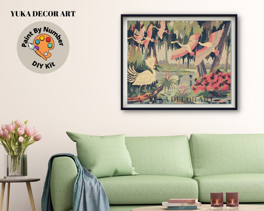 Flying Flamingoes Vintage Style PAINT by NUMBER Kit Adult , Flower Lake DIY Paint Kit , Easy Acrylic Painting,Mid Century Decor Gift