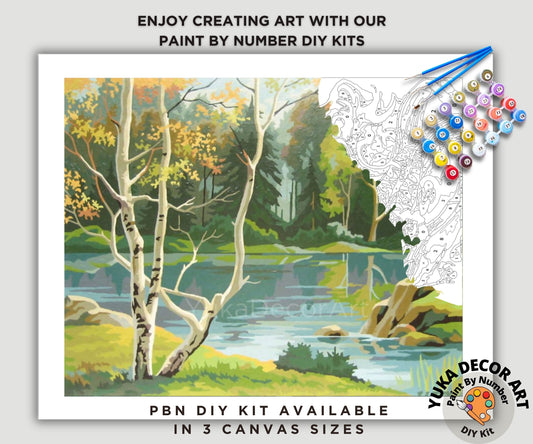 Forest Landscape PAINT by NUMBER Kit Adult Blue Lake Painting Easy Beginners DIY Paint Kit Cabin Decor Vintage Art Gift Mom Dad Grandpa