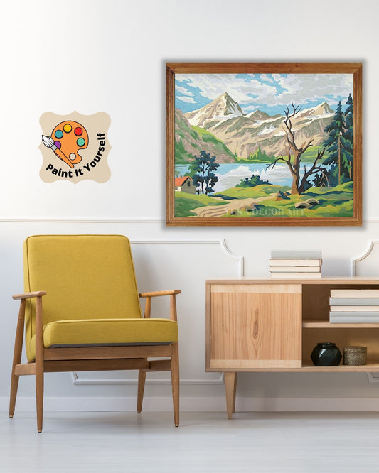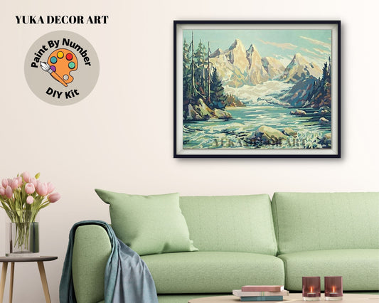 Mountain Lake PAINT by NUMBER DIY Kit for Adult, Snow Mountain Vintage Style Art , Easy Beginner Acrylic Painting ,Rustic Decor Gift