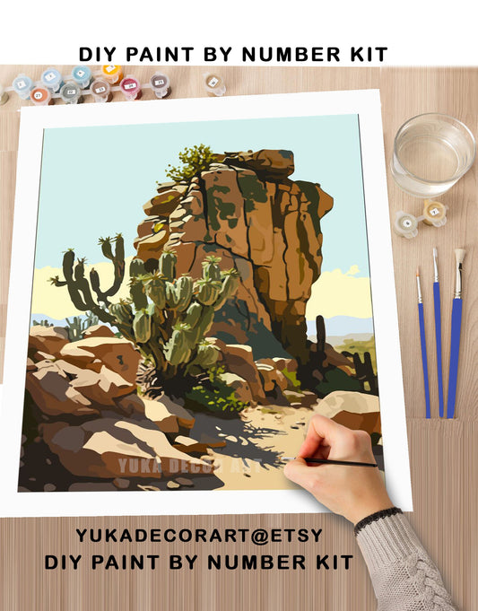 Vintage Inspired PAINT by NUMBER Kit Adult, Desert Rocks Cactus Landscape Painting , Easy Beginners DIY Painting ,Vintage Style Decor Gift
