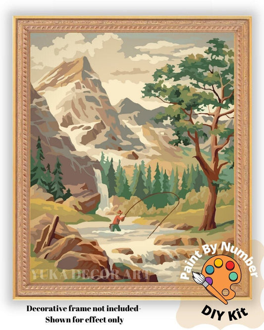 Vintage Mountain PAINT by NUMBER Kit Adult, Fishing In The Stream Scene , Easy Beginner Acrylic Painting DIY Kit,Home Decor Gift