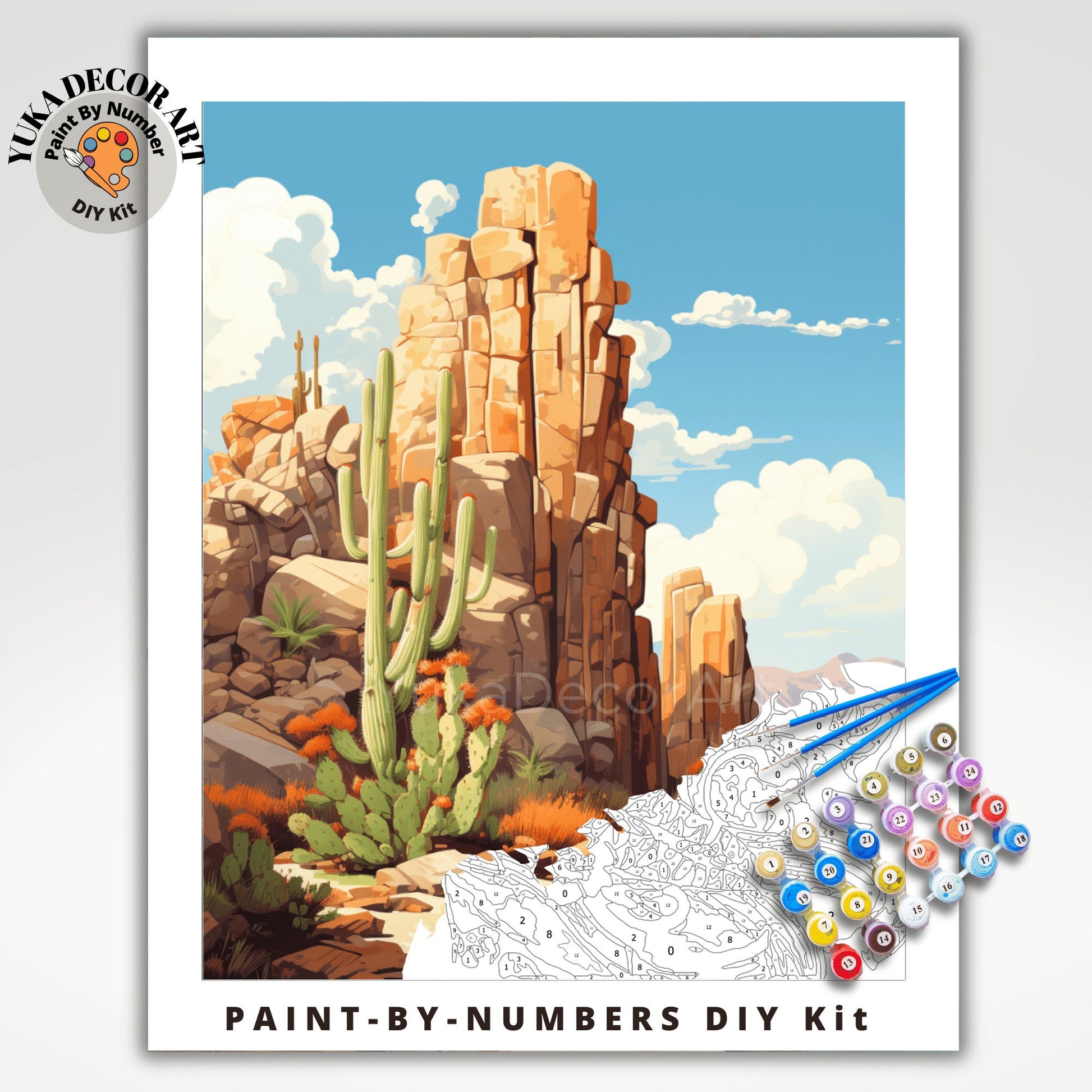 Explore the enchanting world of the desert with our DIY Adult Paint-by-Number Kit, showcasing tall rocky terrain and cacti in a breathtaking landscape art piece. Ideal for adults and beginners, this easy-to-follow acrylic painting kit is the perfect way to infuse your home with a touch of the desert's rugged beauty.