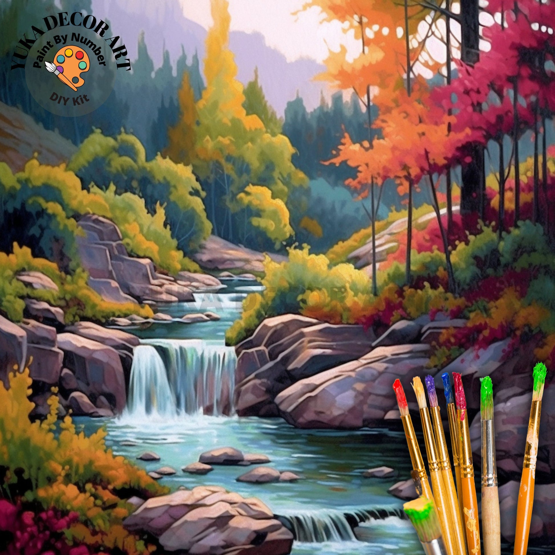 Escape into the beauty of autumn with our DIY Paint-by-Number Kit showcasing a picturesque mountain fall scene and river stream cascading down a rocky terrain amidst a lush forest backdrop, all in vibrant warm colors. This easy beginner acrylic painting DIY kit is perfect for all ages, allowing you to unleash your inner artist and create stunning landscape art. With numbered canvases and premium acrylic paints, crafting your masterpiece is a breeze. Elevate your home decor or gift it to a loved one with this charming kit. Transform any space into a serene sanctuary with personalized wall art, perfect for kids' rooms or living areas.
