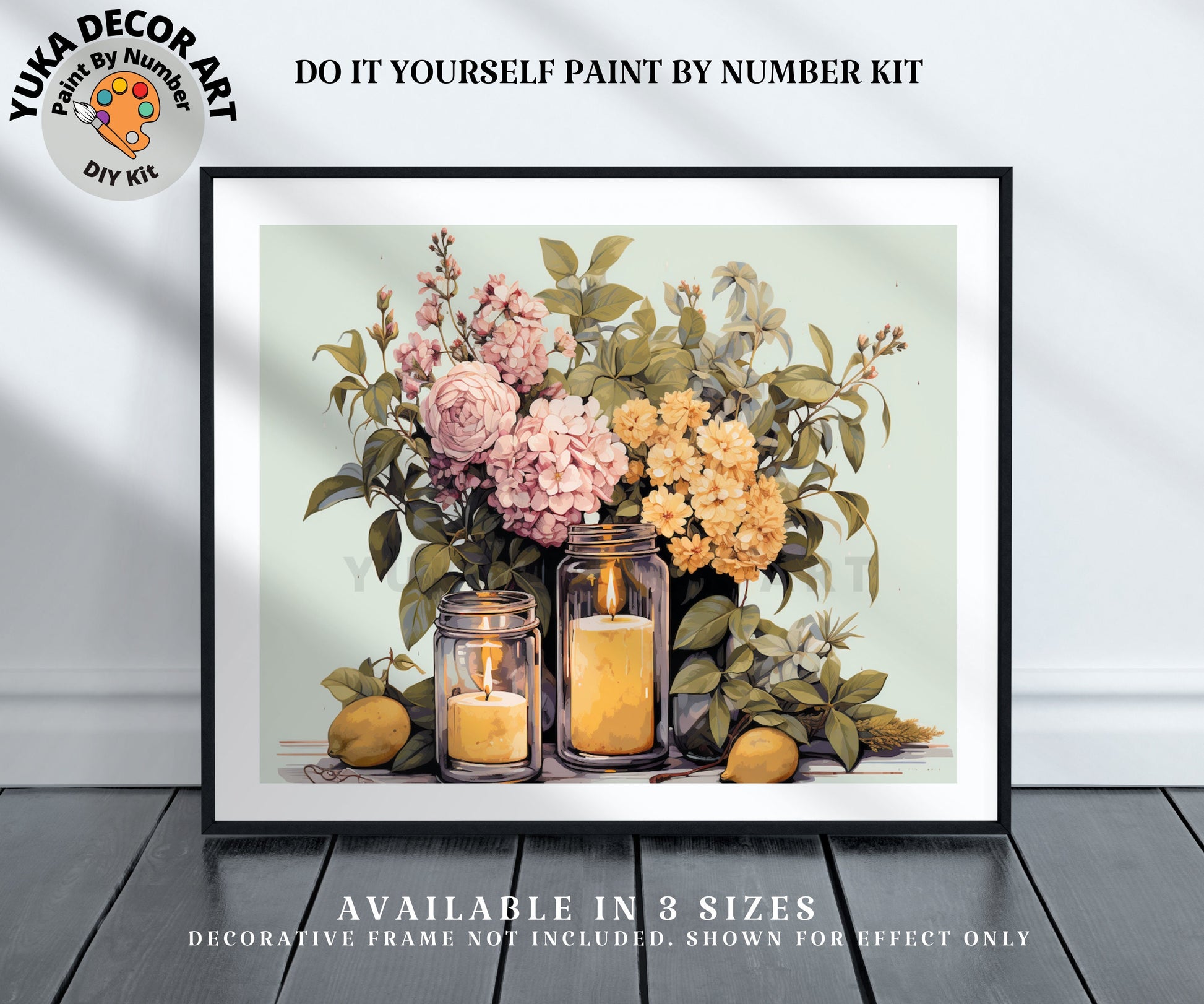 Embrace the rustic charm of a blooming garden with our Adult Paint by Number Kit, featuring a delightful still life composition of garden flowers. This beautiful country home scene showcases a bouquet of flowers like begonias, apple blossoms, peach and yellow blossoms, bluebonnets, geraniums, dahlias, carnations, and peonies, all elegantly arranged in glass mason jars lit with candles. Perfect for both art enthusiasts and beginners, this acrylic masterpiece adds a touch of nature's elegance to any space.