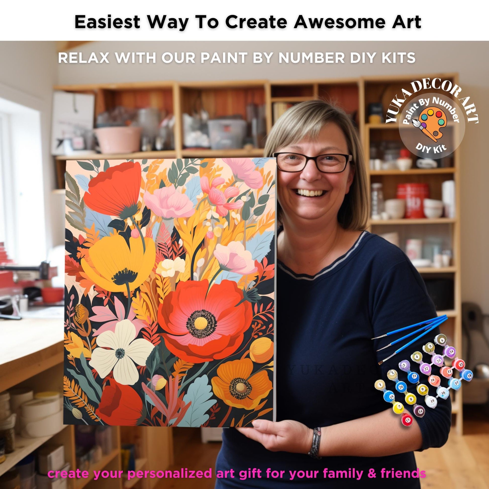 Unleash your creativity and brighten your walls with this charming color by number kit, perfect for any nature or flower lover.Our Floral DIY Paint by Number Kit makes an excellent gift for adults of all ages, from teenagers to senior art enthusiasts. Even if you've never painted before, you can create a stunning masterpiece in three simple steps. This kit evokes nostalgia for the 1960s and 1970s Paint By Number hobby, making it a thoughtful gift for your parents and grandparents.