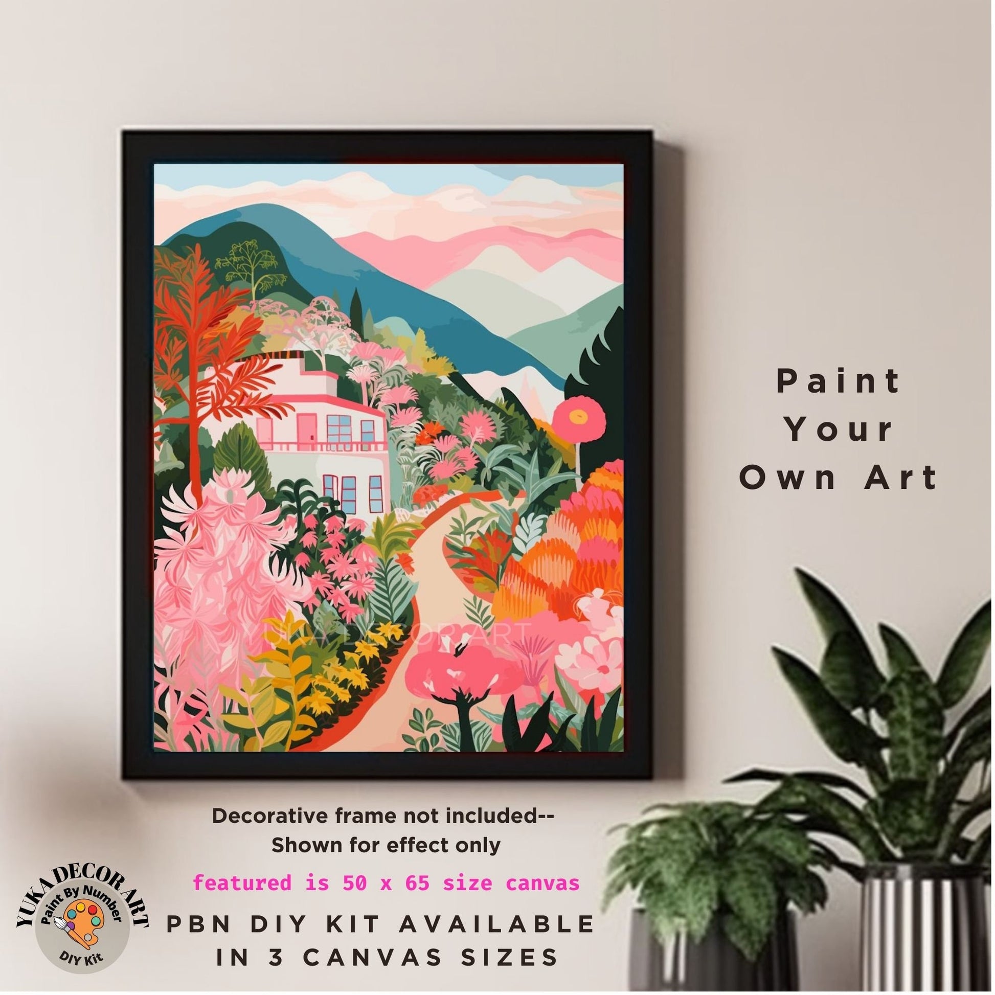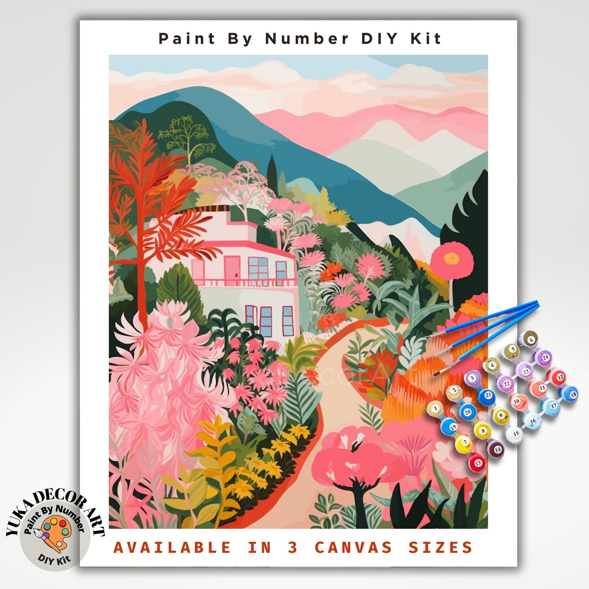 Explore our enchanting collection of paint by number adult kits that transport you to the idyllic Mountain landscape with vibrant wildflowers . Our diy paint kits help you create wall art that beautifully captures these travel destinations in a minimalistic style, evoking the soft charm and dreamy pastel color palette of the region.