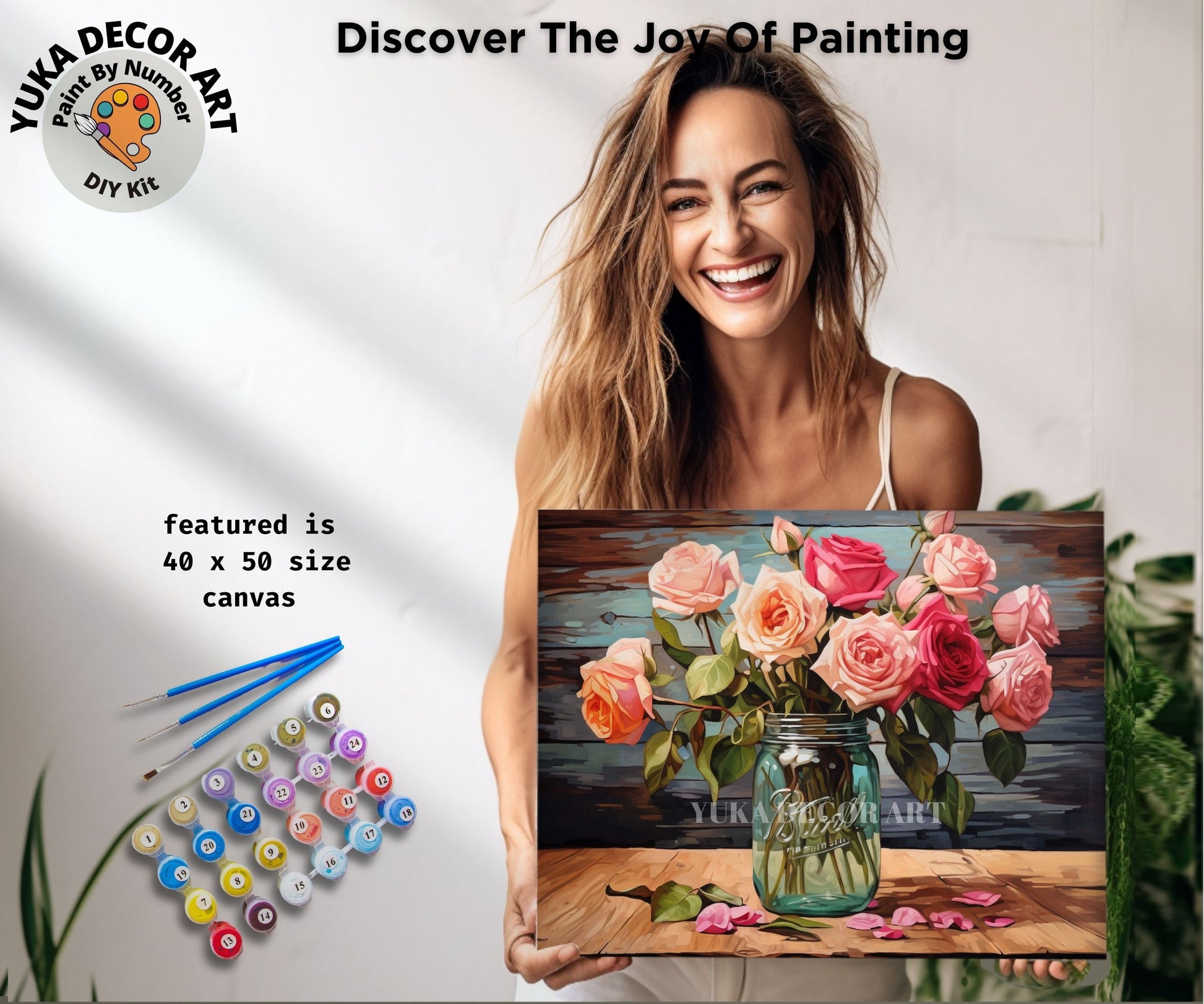 PAINT by NUMBER DIY Kit Adult Garden Roses Red Pink Flowers Rustic Decor Easy Beginner Acrylic Paint Wall Art Birthday Gift Mom Girlfriend