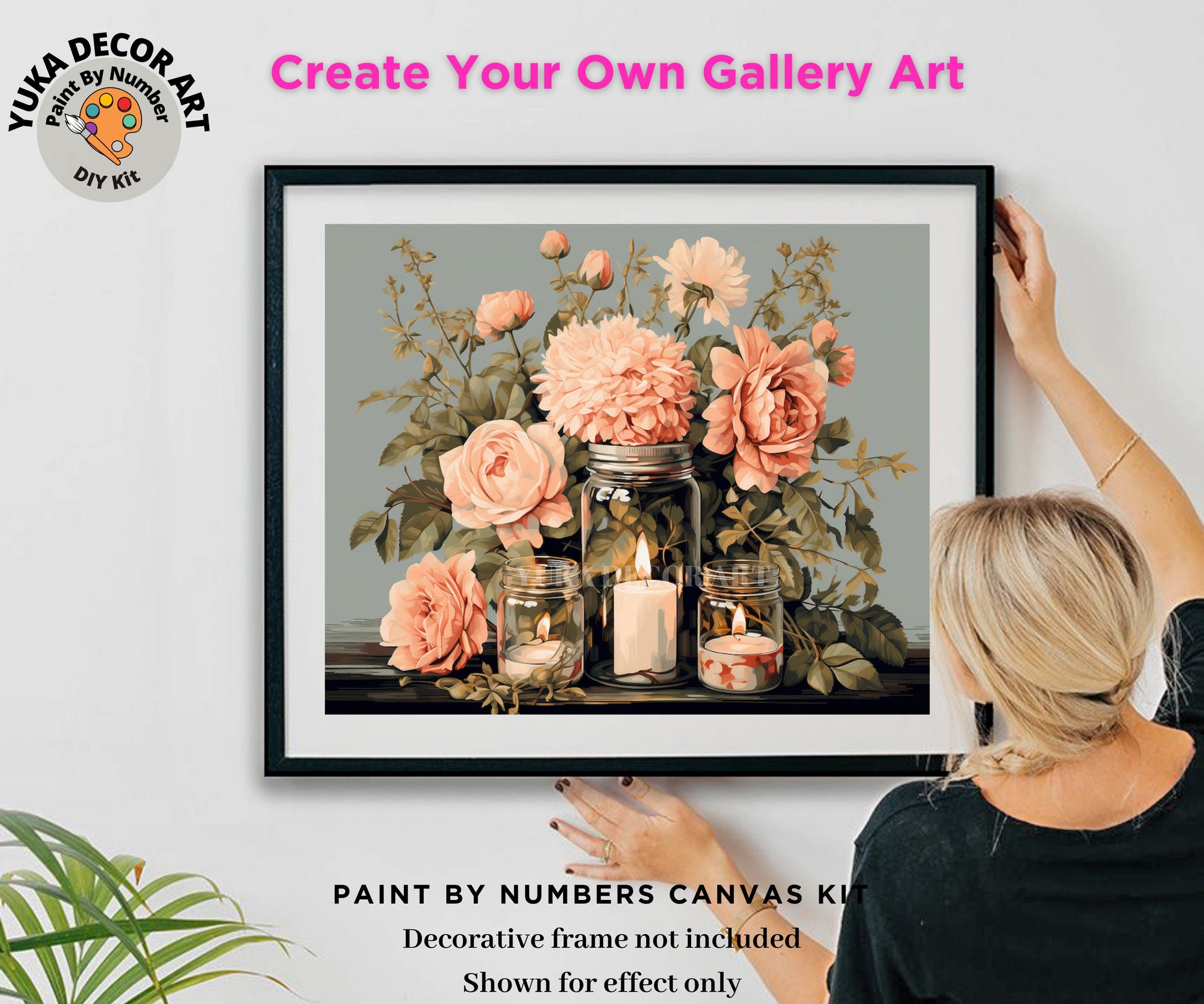 Embrace the rustic charm of a blooming garden with our Adult Paint by Number Kit, featuring a delightful still life composition of garden flowers. This beautiful country home scene showcases a bouquet of flowers like begonias, apple blossoms, peach and yellow blossoms, bluebonnets, geraniums, dahlias, carnations, and peonies, all elegantly arranged in glass mason jars lit with candles. Perfect for both art enthusiasts and beginners, this acrylic masterpiece adds a touch of nature's elegance to any space.