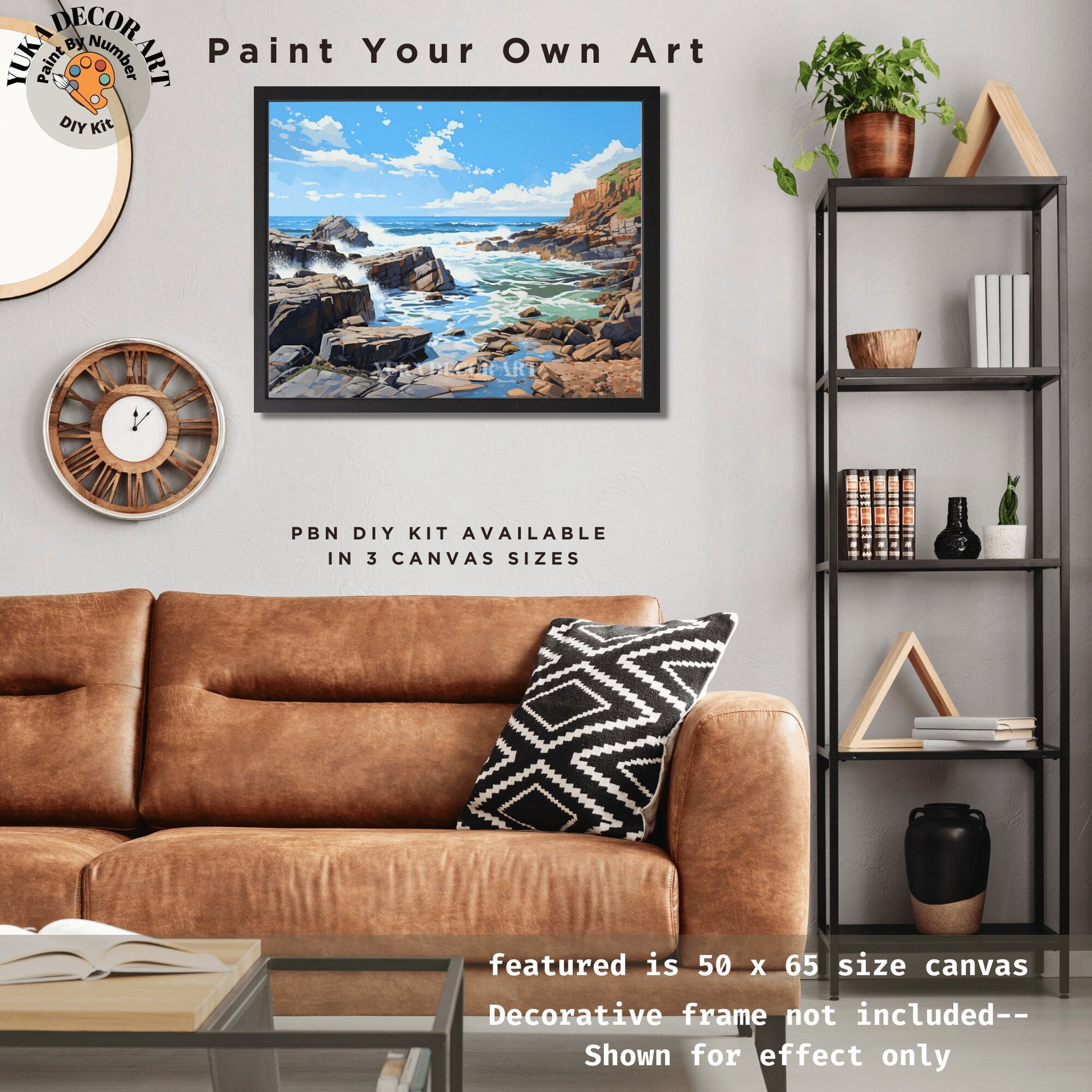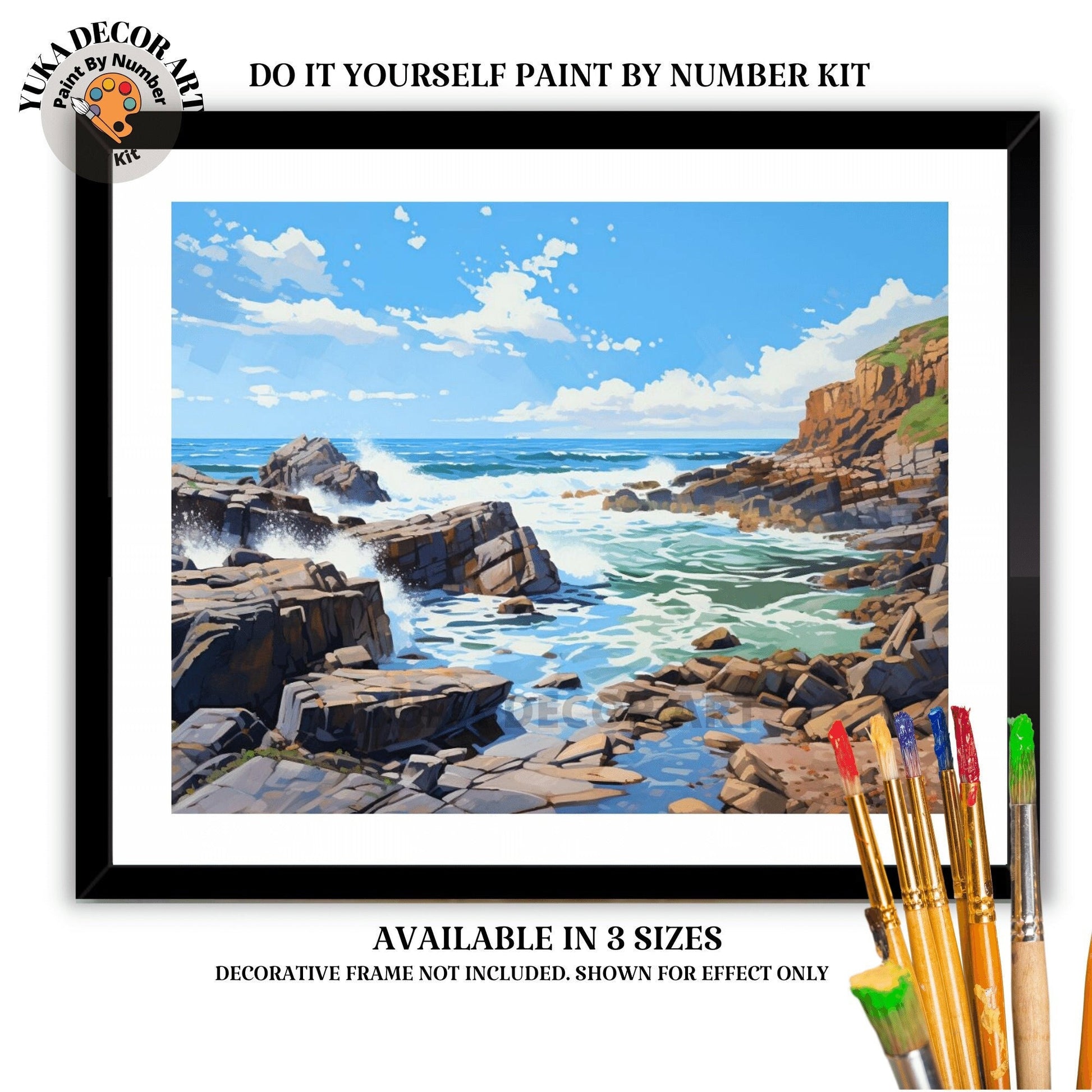 Elevate your creativity with our Adult DIY Paint-by-Number Kit, featuring a breathtaking seascape with cliffs, a rocky beach, and a radiant blue sky. Dive into the world of easy, beginner-friendly acrylic painting as you recreate this stunning landscape, perfect for adults. The azure and teal waters glisten in the sun, while white waves crash against the shore.