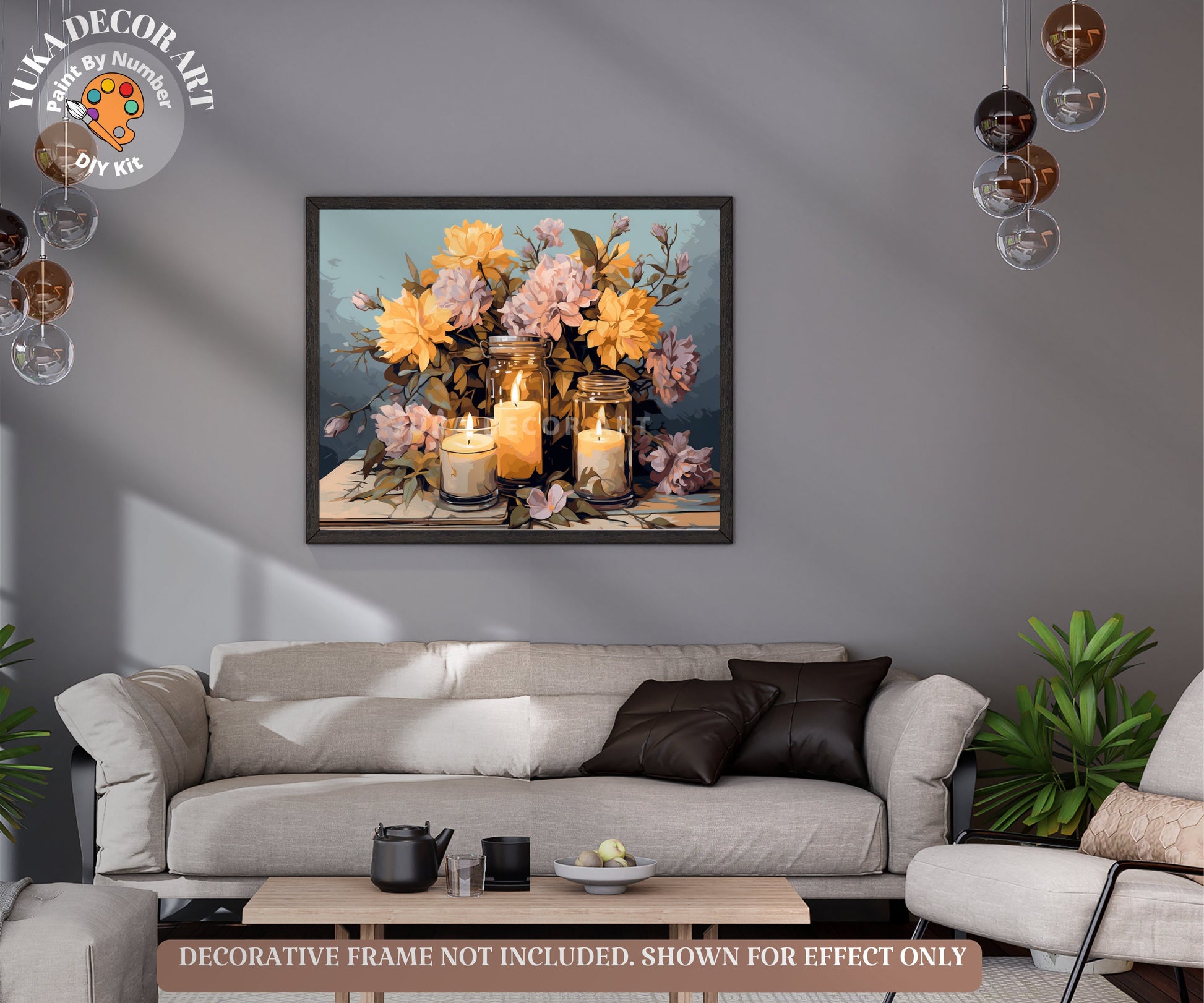 Embrace the rustic charm of a blooming garden with our Adult Paint by Number Kit, featuring a delightful still life composition of garden flowers. This beautiful country home scene showcases a bouquet of flowers like begonias, apple blossoms, peach and yellow blossoms, bluebonnets, geraniums, dahlias, carnations, and peonies, all elegantly arranged in glass mason jars lit with candles. Perfect for both art enthusiasts and beginners, this acrylic masterpiece adds a touch of nature's elegance to any space.