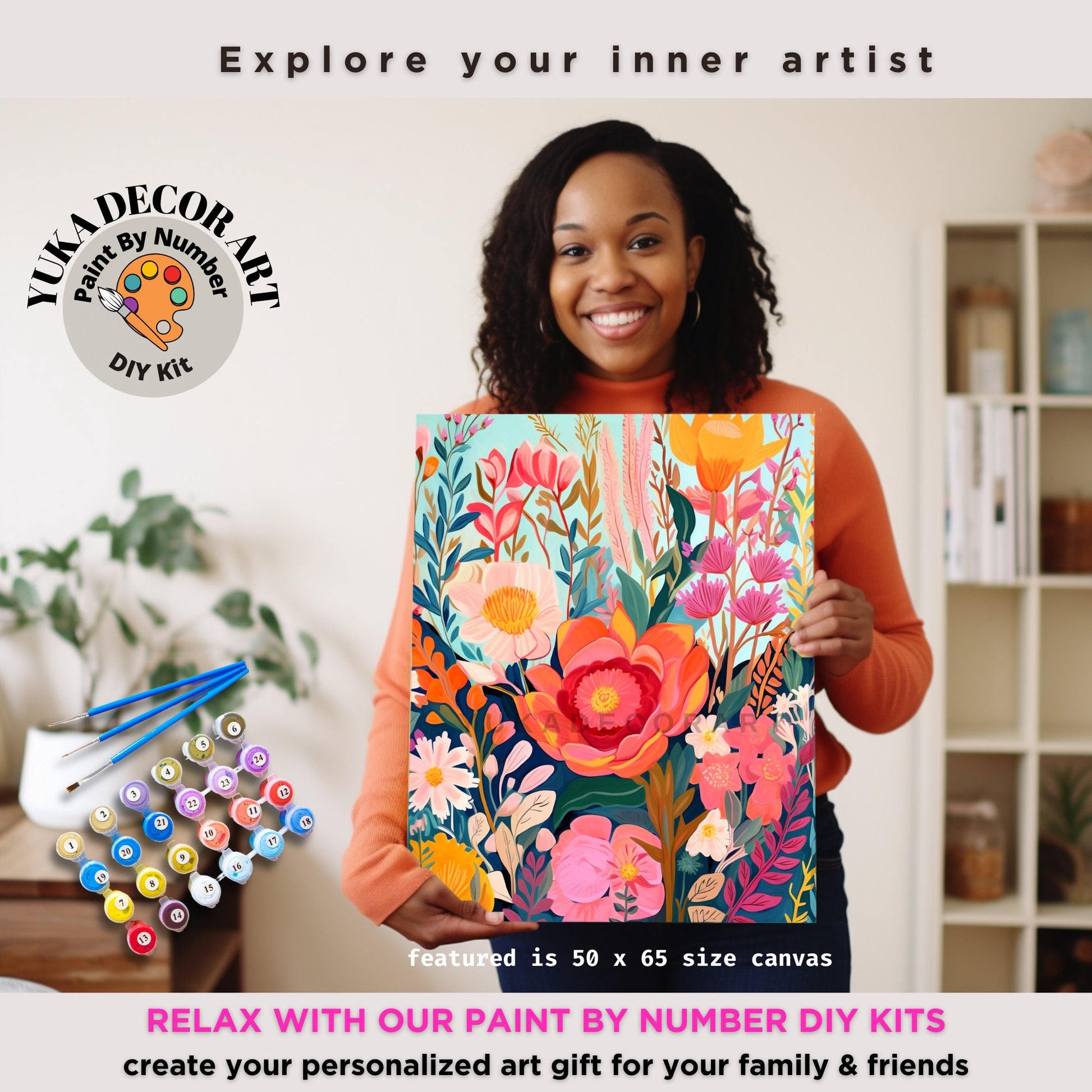 This Modern Style Floral Paint by Number DIY Kit is a great gift idea for adults of any age from a teenager to senior adults who love this popular style of hobby kits from decades back. You can paint a beautiful picture even if you've never picked up a brush in your life. Start away in just 1-2-3 steps!